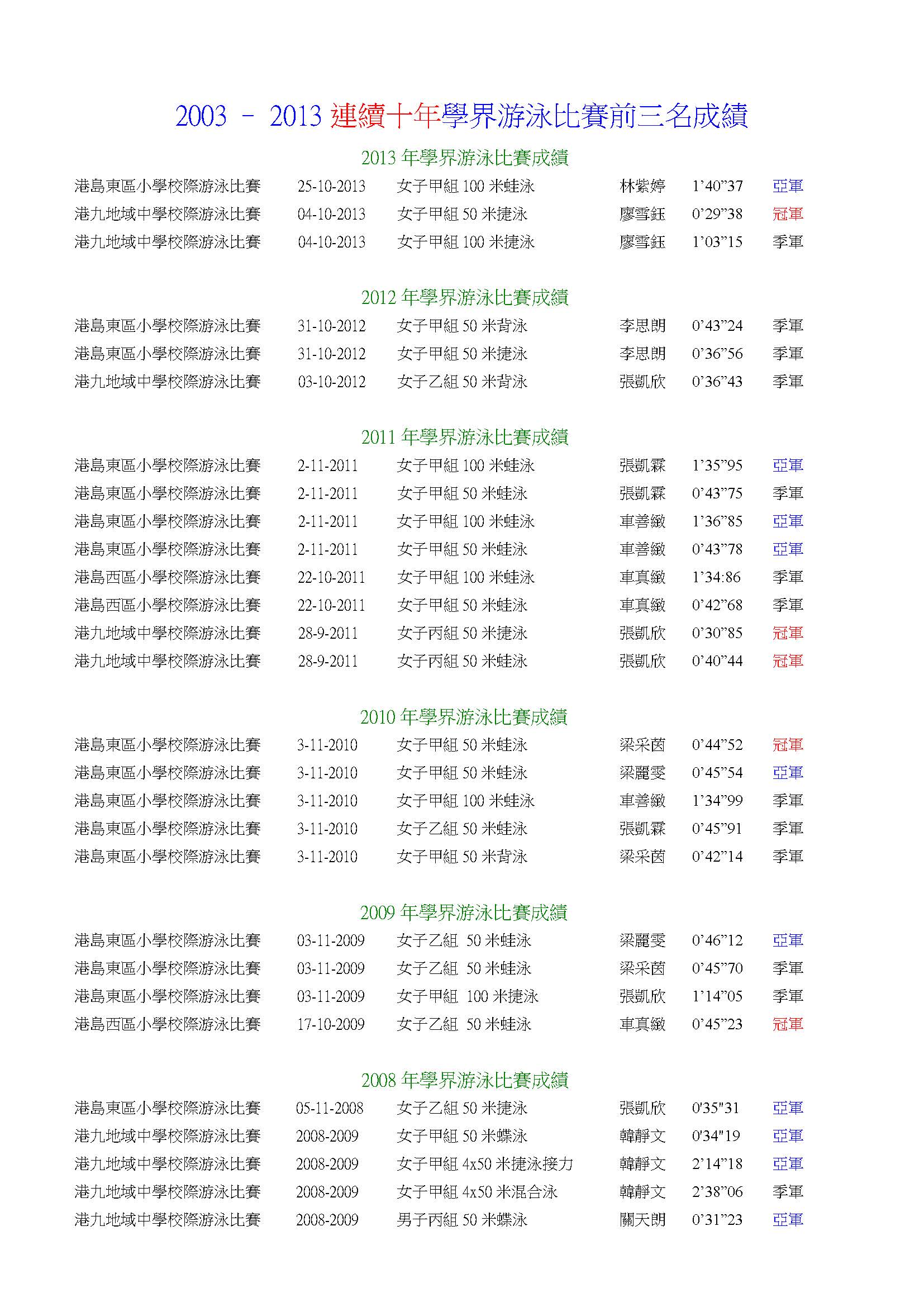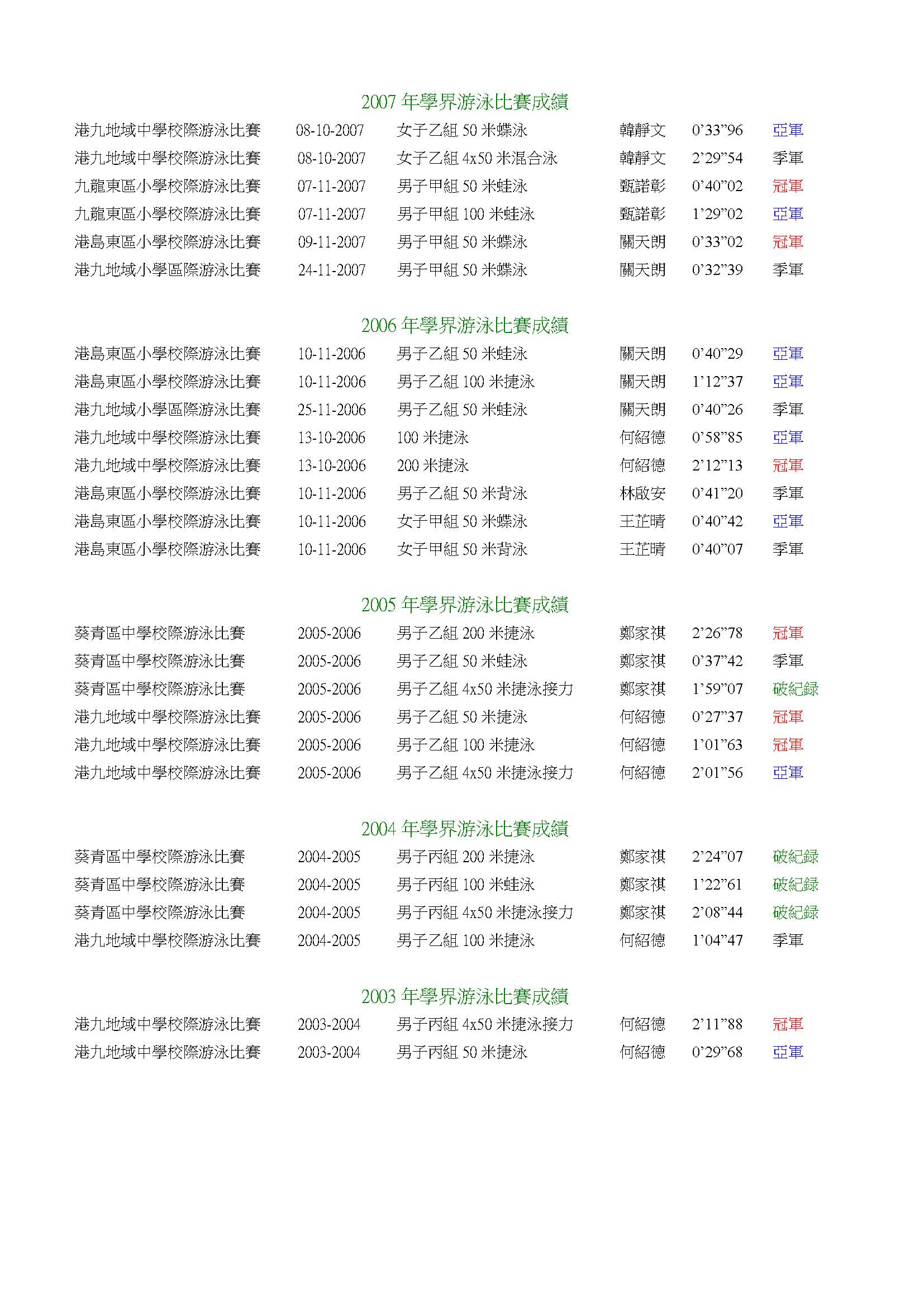 衛星游泳會學界游泳成績